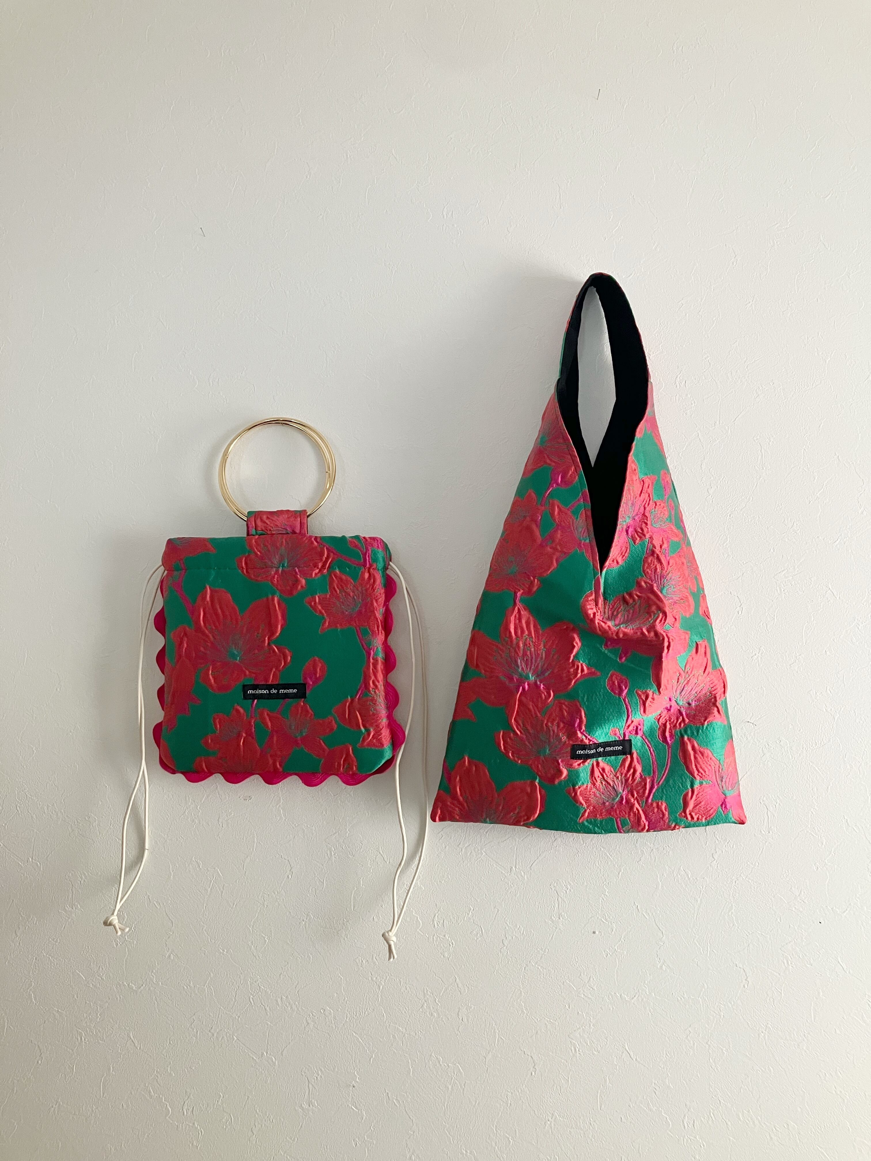 明るくつよいピンクと、グリーンがぶつかり溶け合う華やかな生地です。