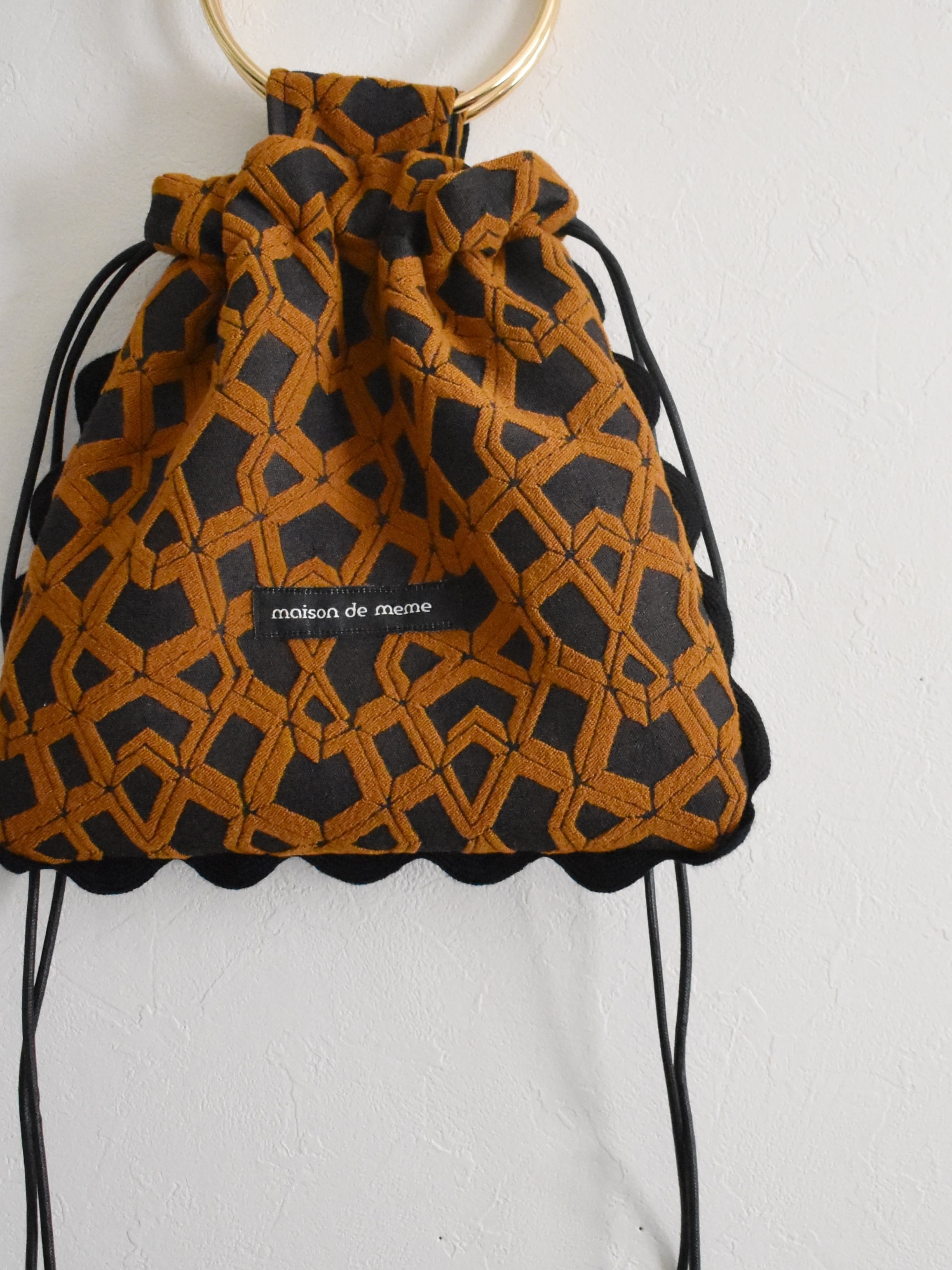 美しい生地を正方形に切り取った巾着バッグ。