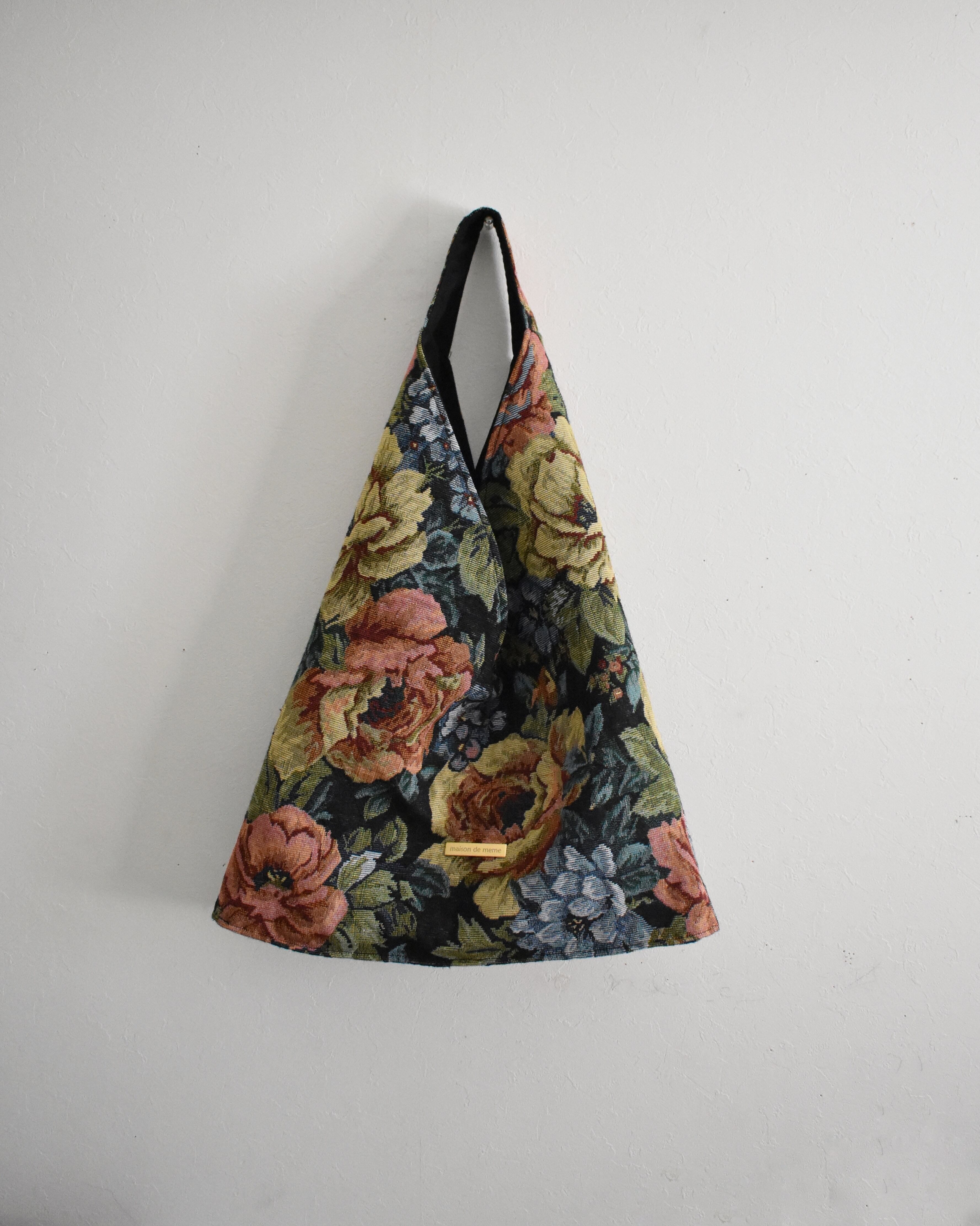 静かな佇まいながら、彩り豊かな花たちがそっと咲き誇るドラマチックな柄のゴブラン織でお作りしました。シンプルな装いの華やかなポイントに。