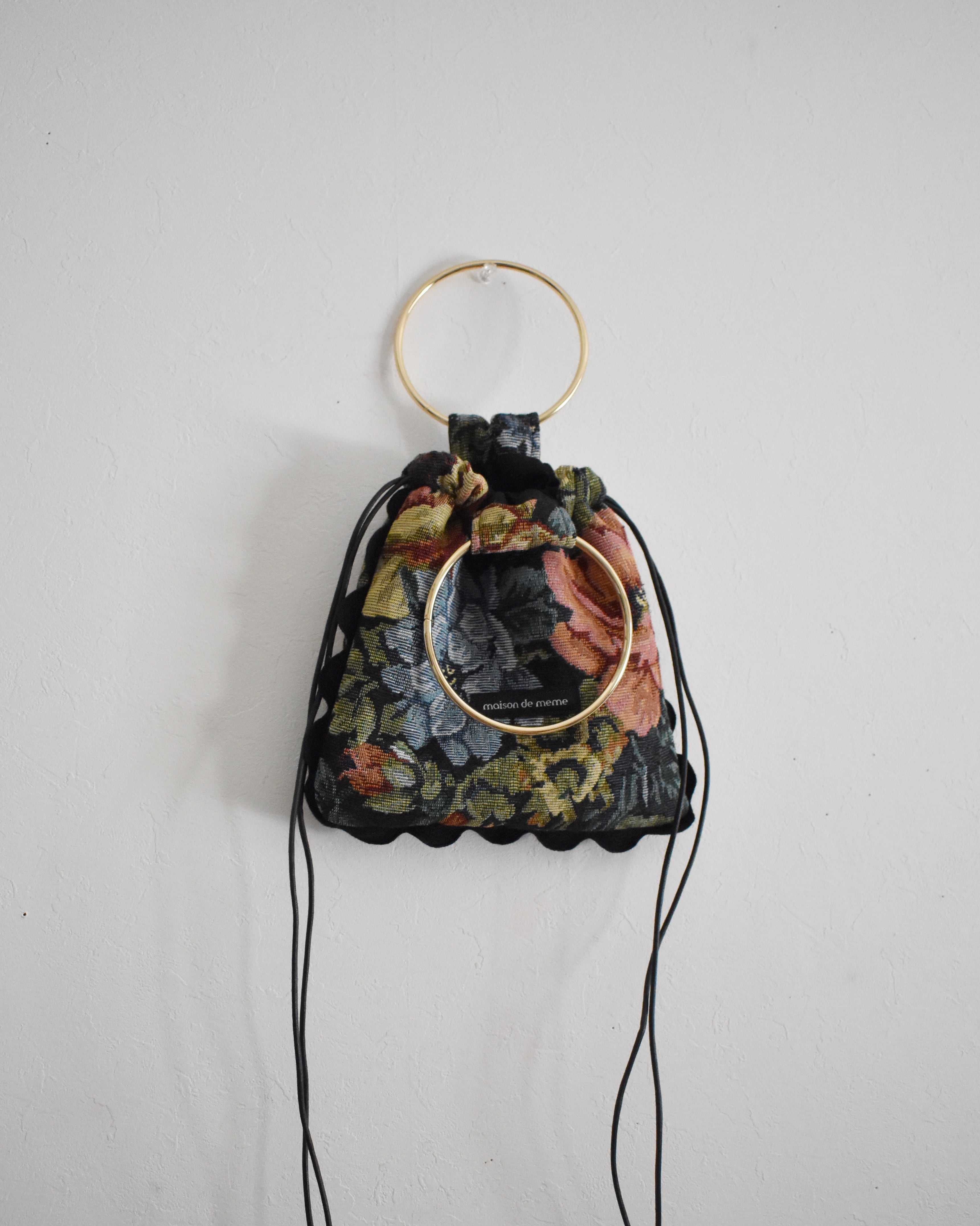 美しい生地を正方形に切り取った巾着バッグ。