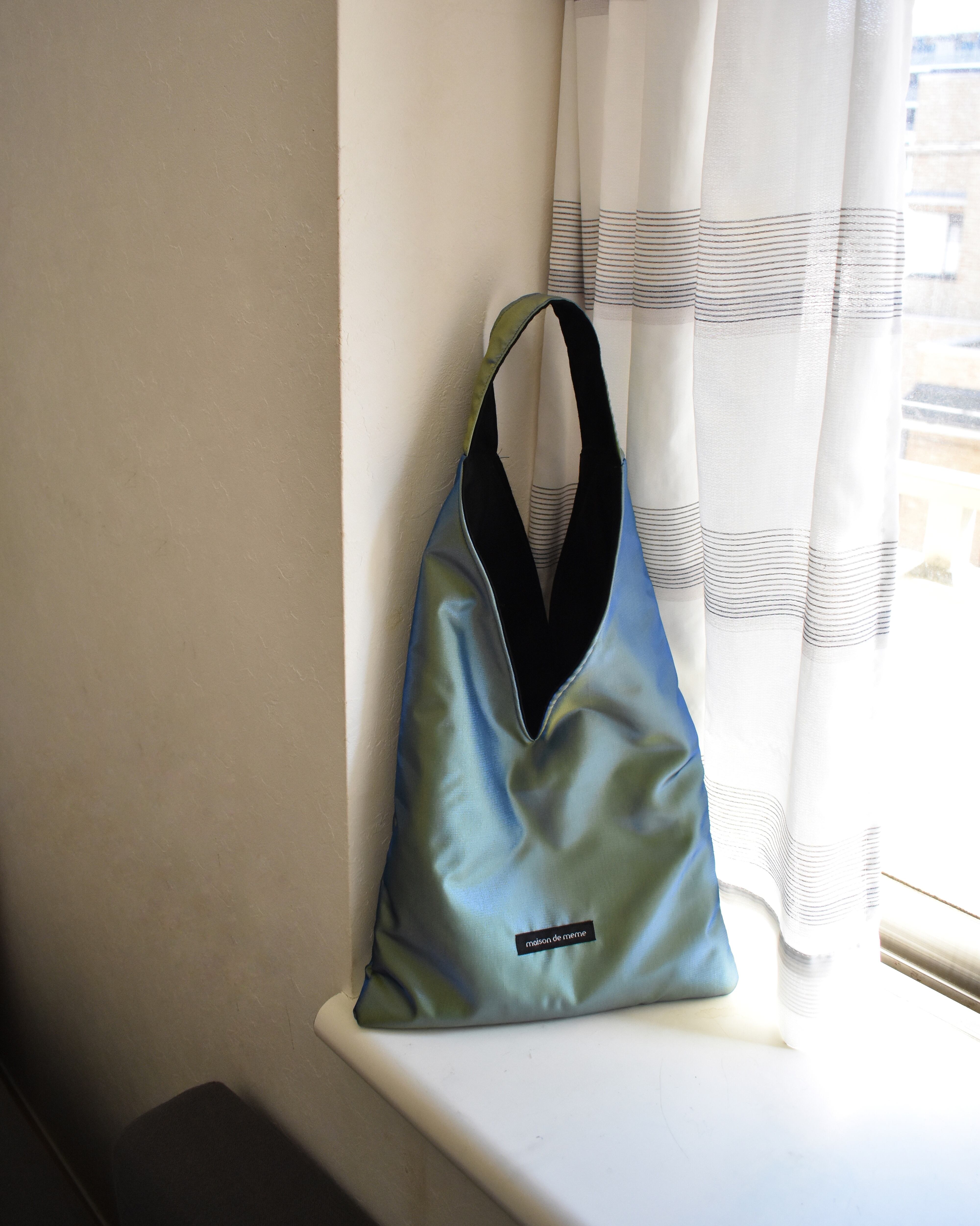 明るさや角度によって色がかわる偏光サテンでお作りしました。黄色の地に、青い糸のかけられた生地は、これから訪れる温かい季節の予感のようです。