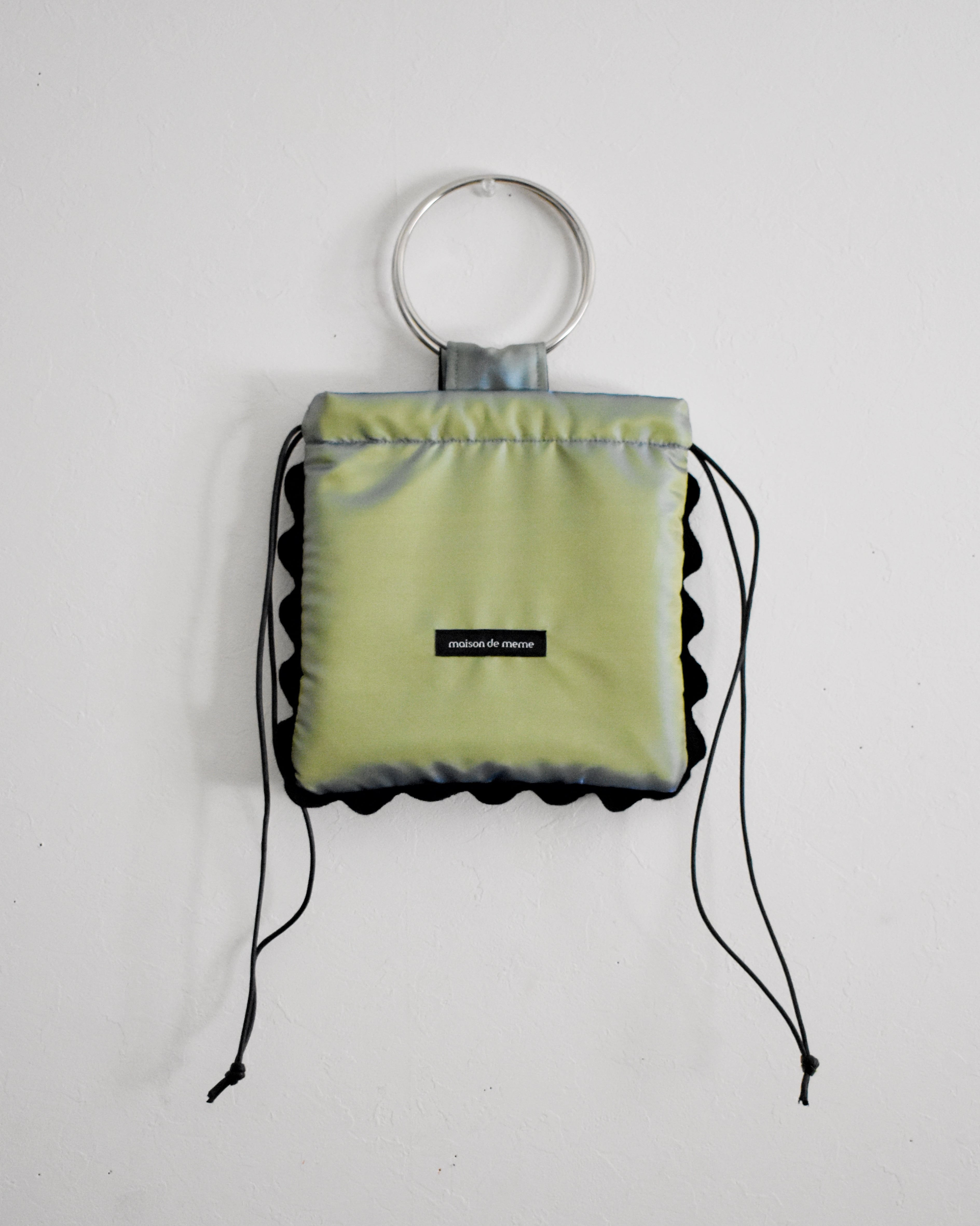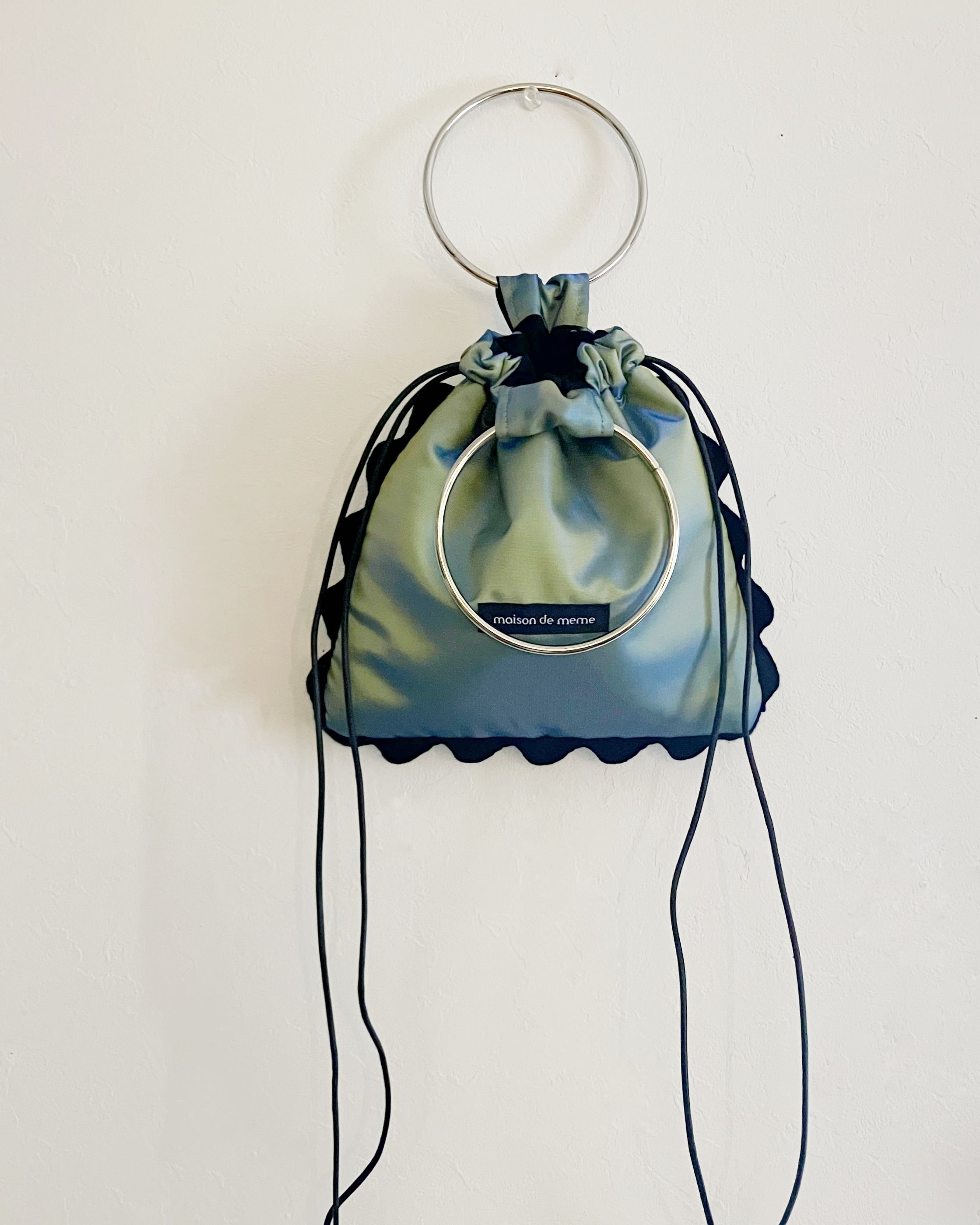 明るさや角度によって色がかわる偏光サテンでお作りしたバッグです。リングはシルバーを合わせてクールに。メタリックな異素材感は、装いを一段深くしてくれます。