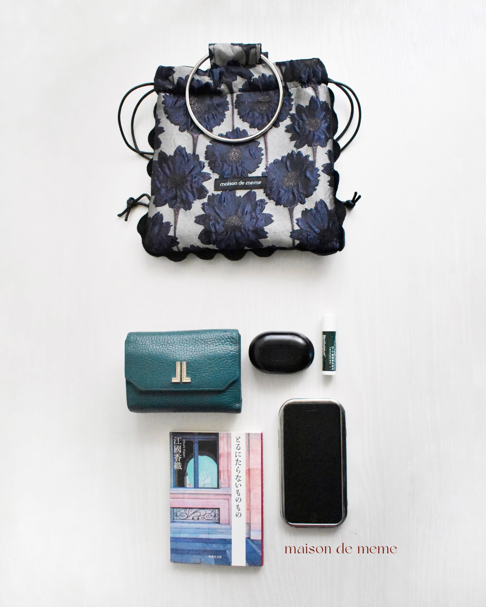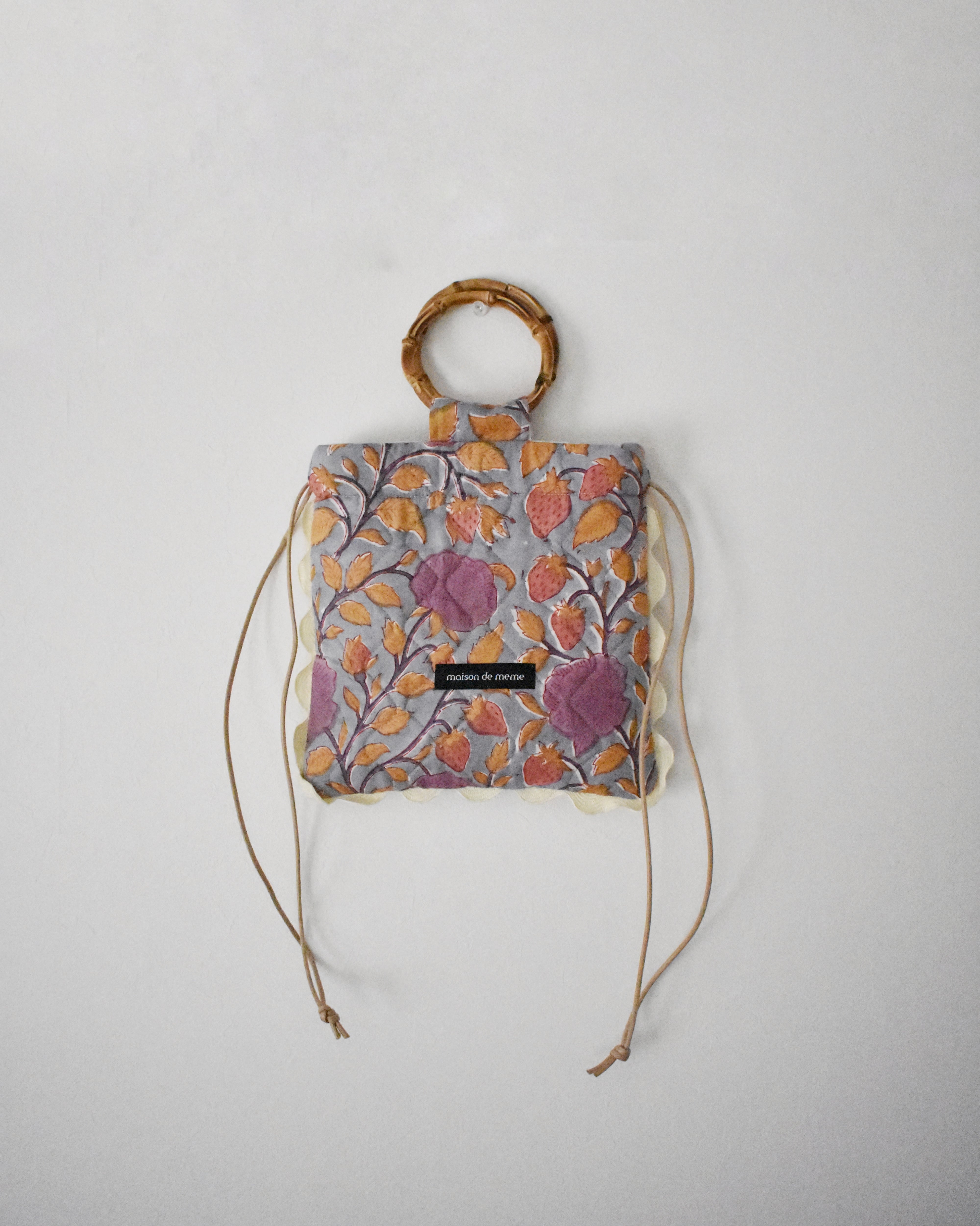 ジャガード生地の美しさを、“額縁”のように閉じ込めたスクエア型の巾着バッグ。