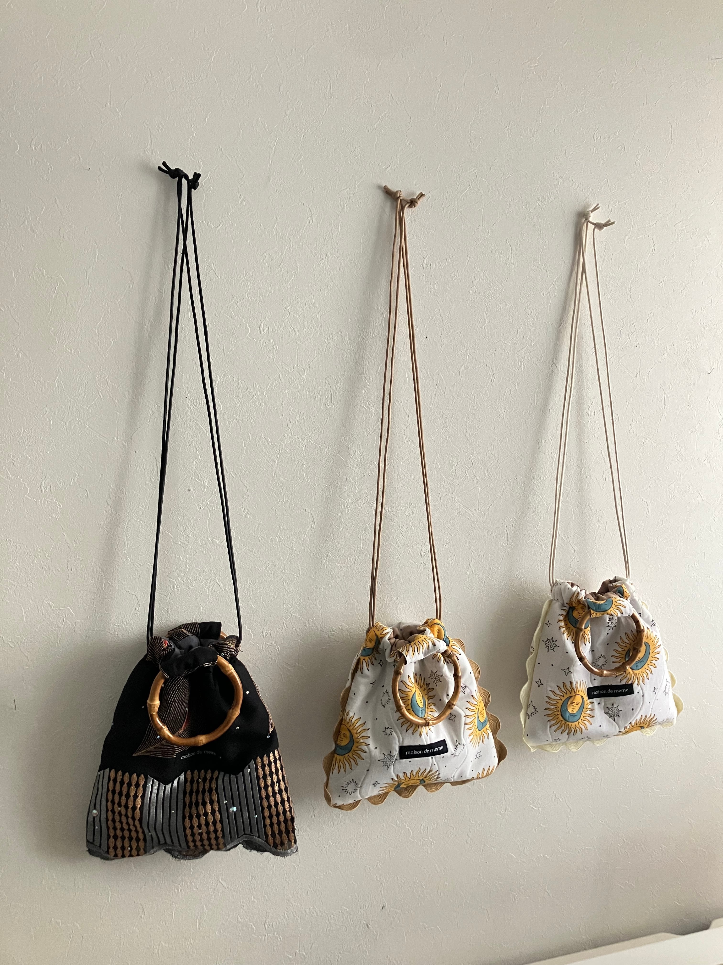 紐をきゅっと絞って巾着として。リングハンドルでラフに持っても。持ち方ひとつで、印象が変わるのも魅力です。