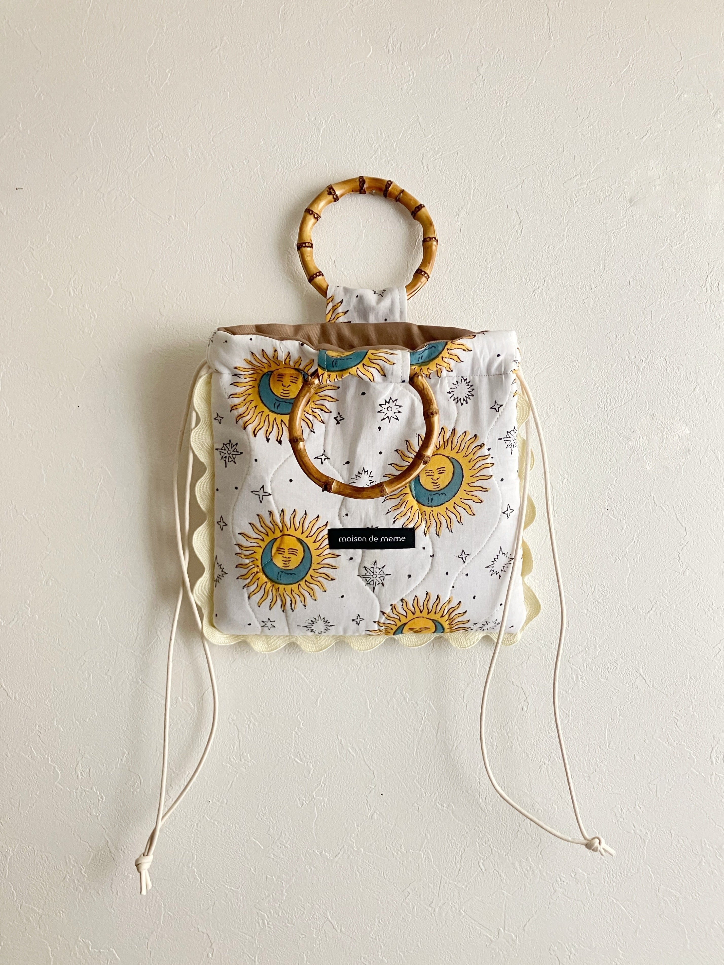 ジャガード生地の美しさを、“額縁”のように閉じ込めたスクエア型の巾着バッグ。