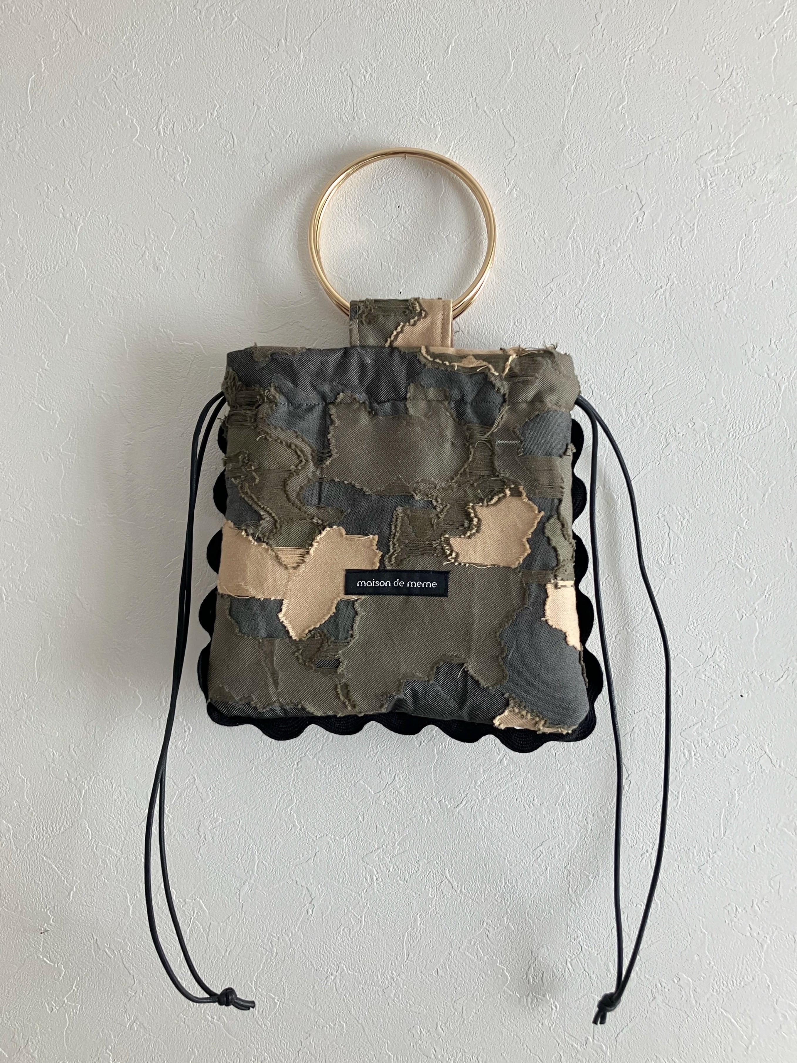 紐をきゅっと絞って巾着として。リングハンドルでラフに持っても。持ち方ひとつで、印象が変わるのも魅力です。