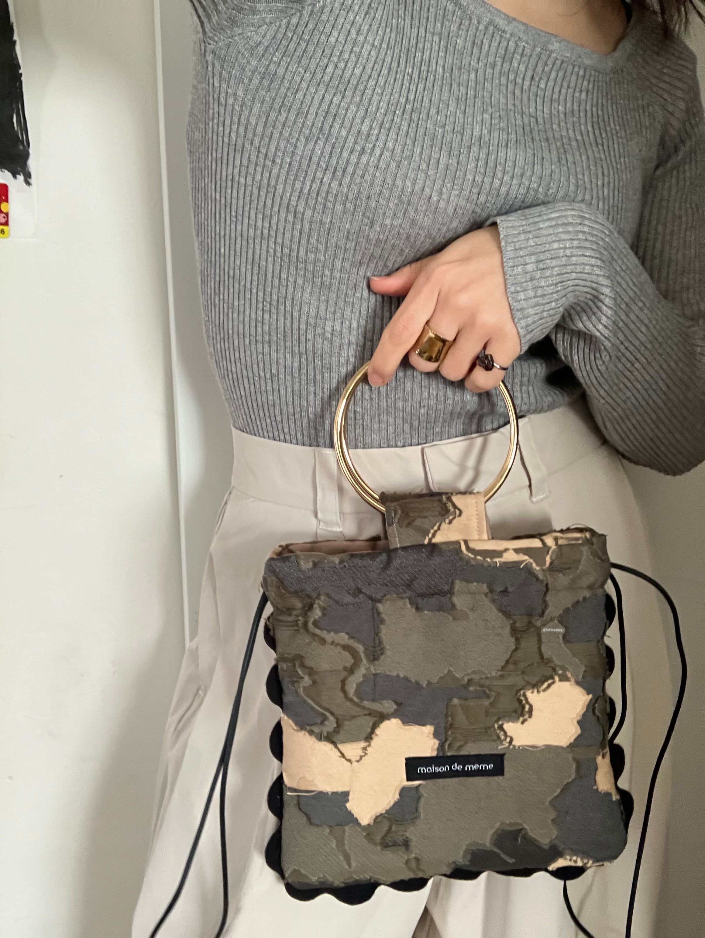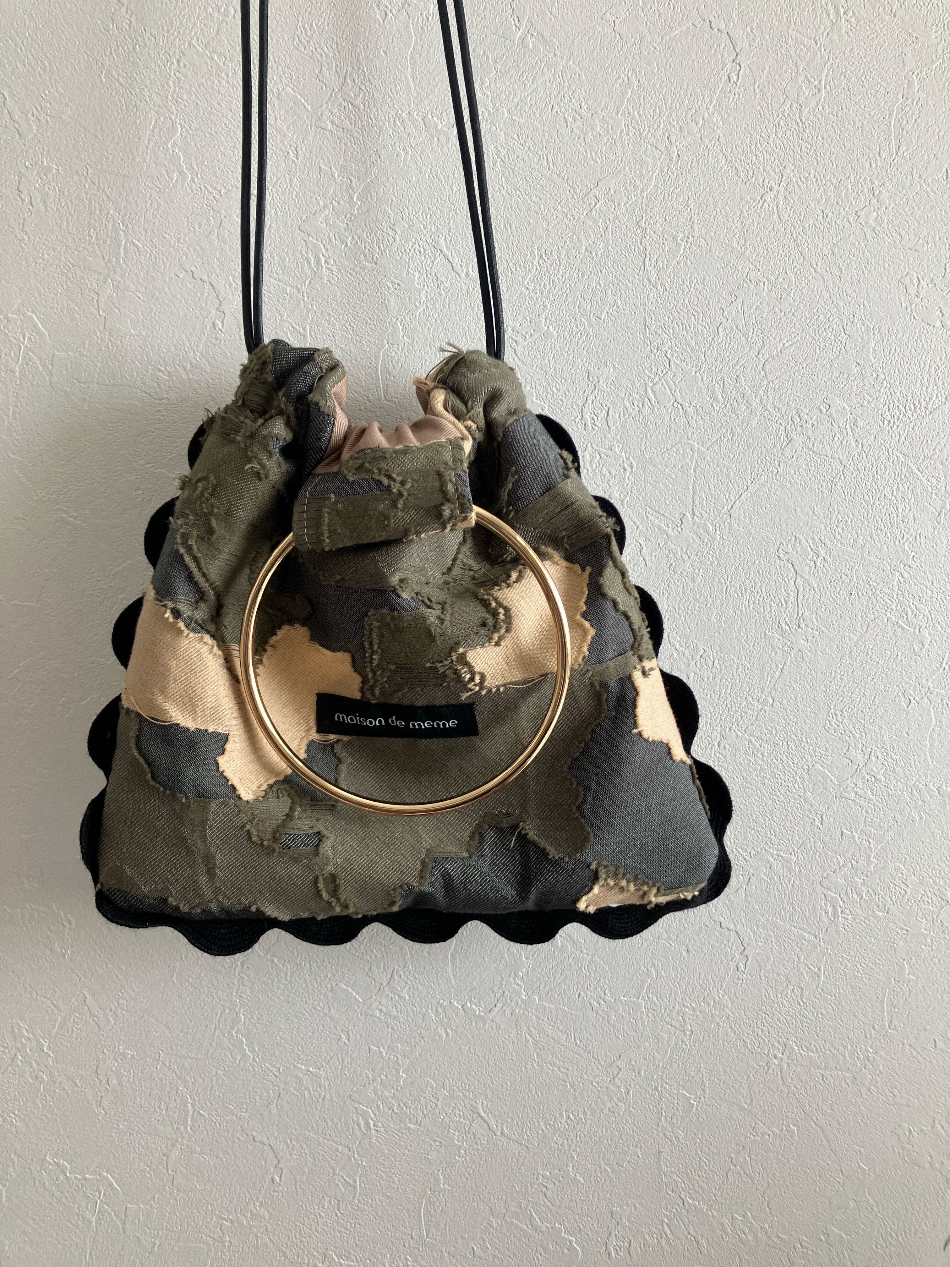 ジャガード生地の美しさを、“額縁”のように閉じ込めたスクエア型の巾着バッグ。