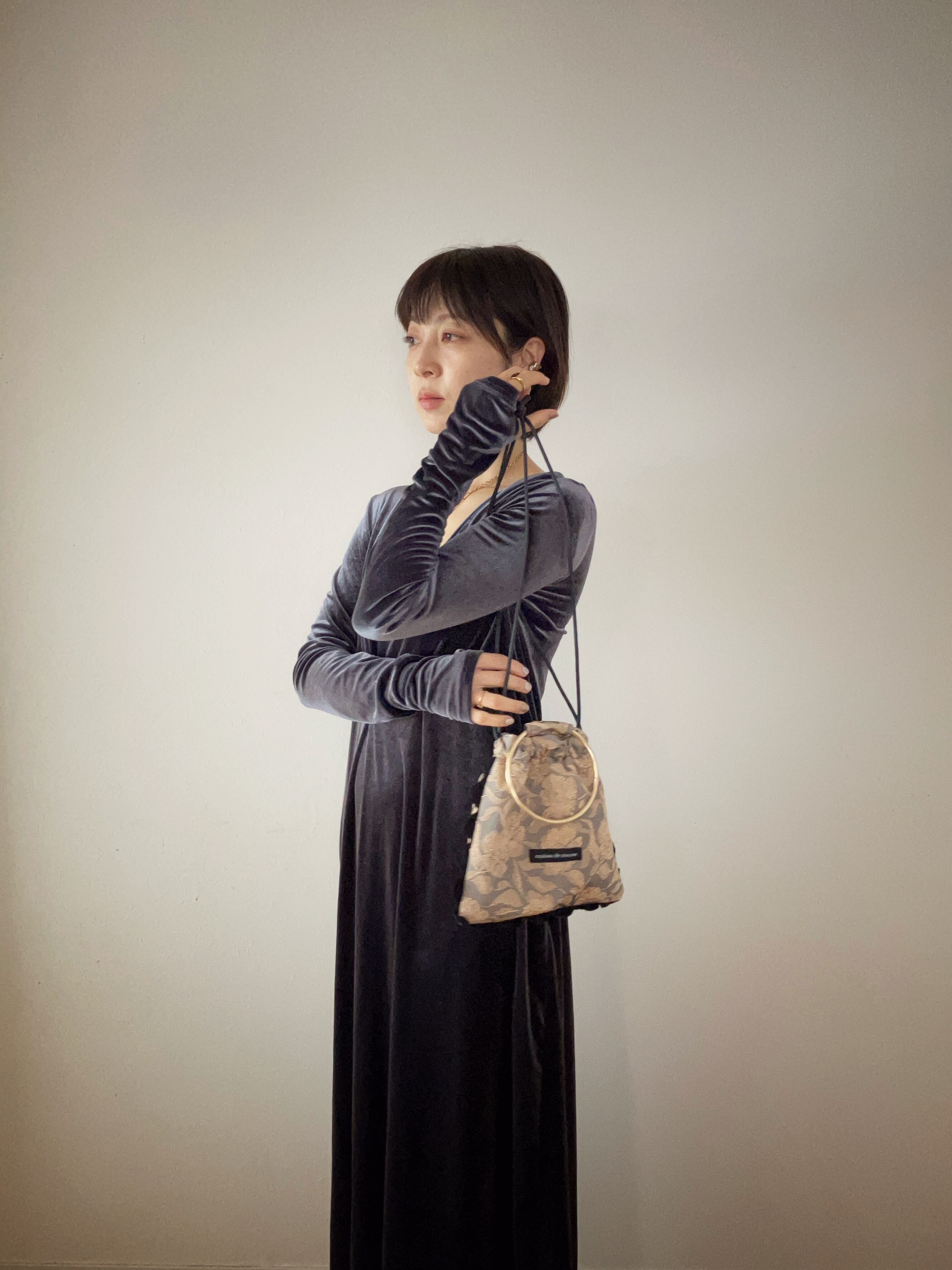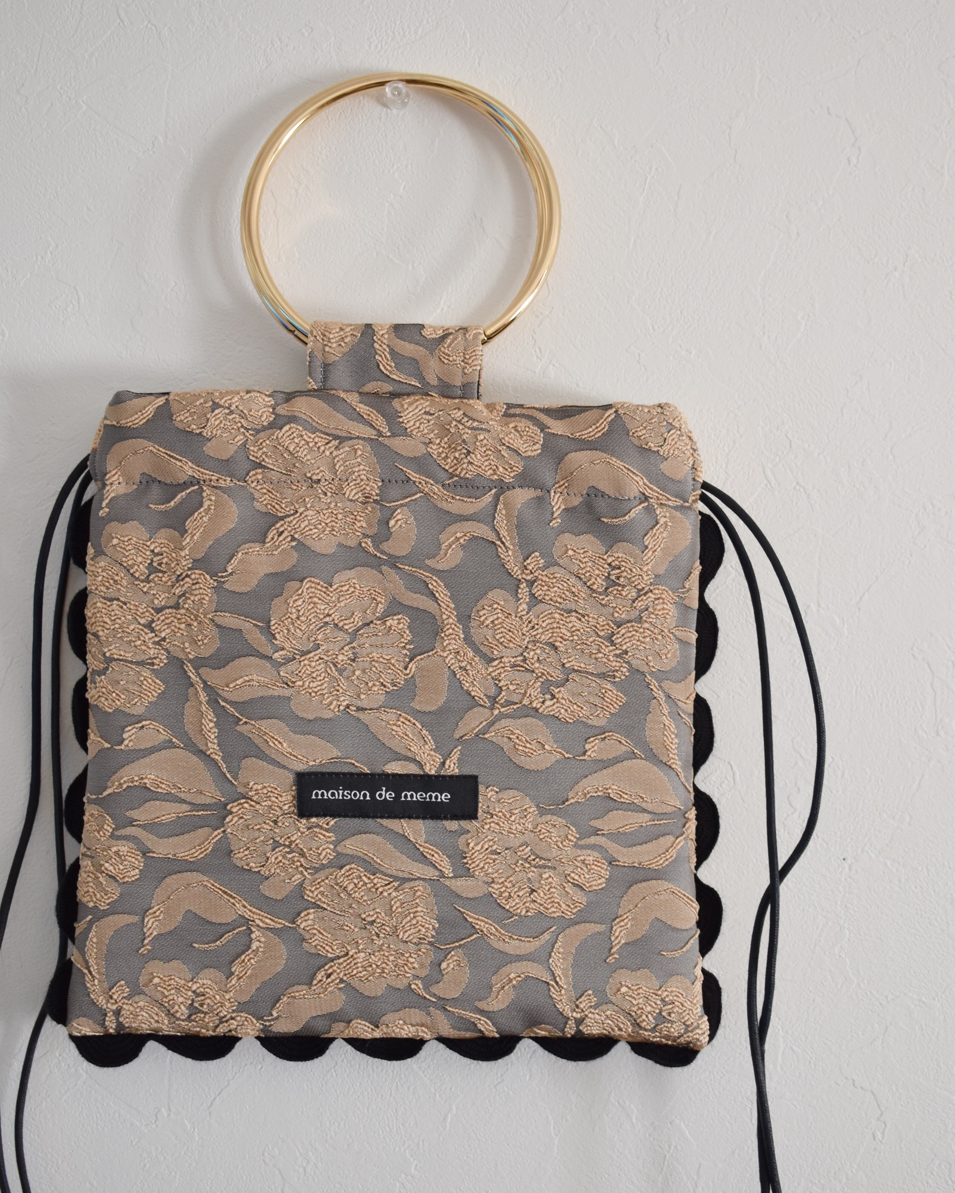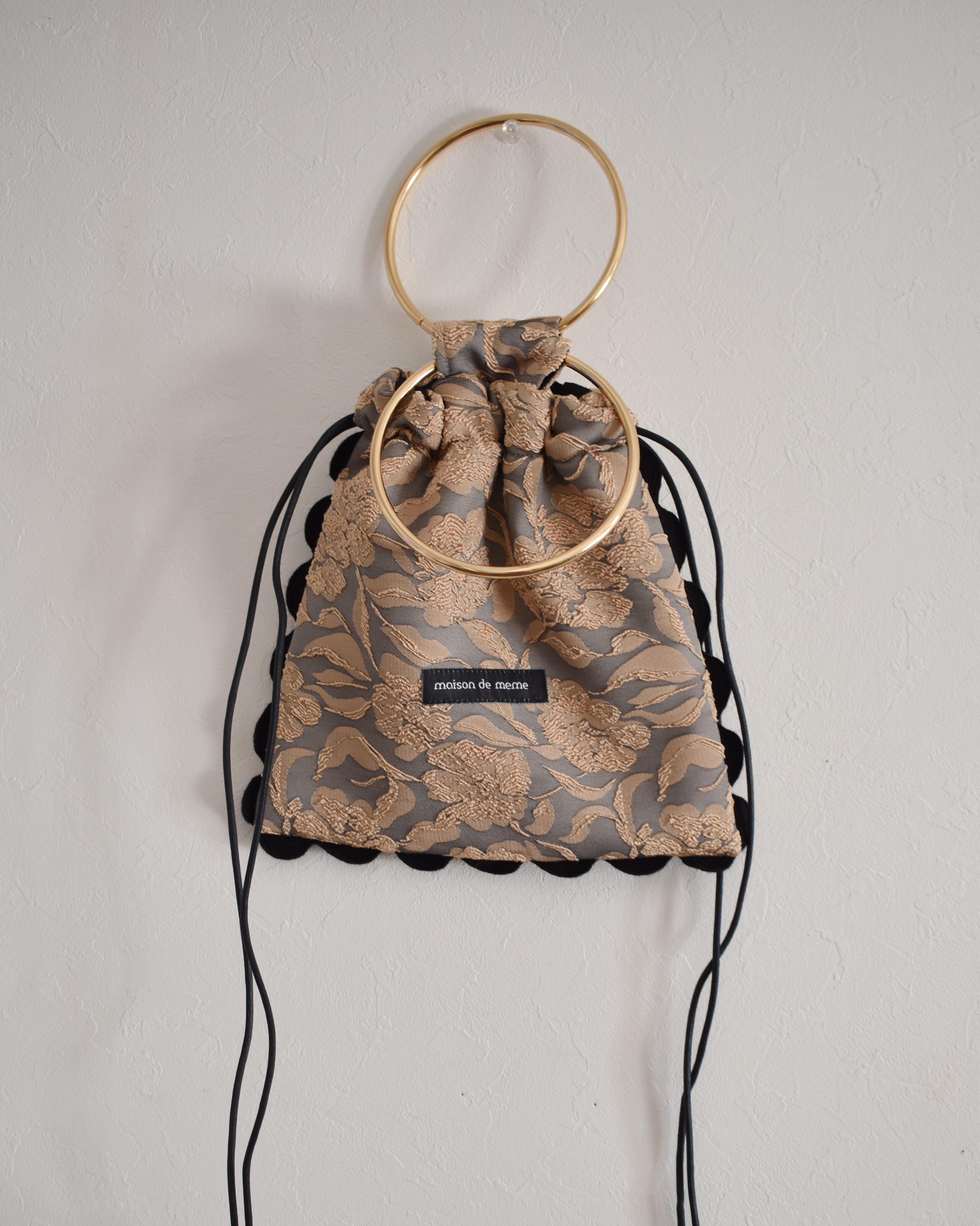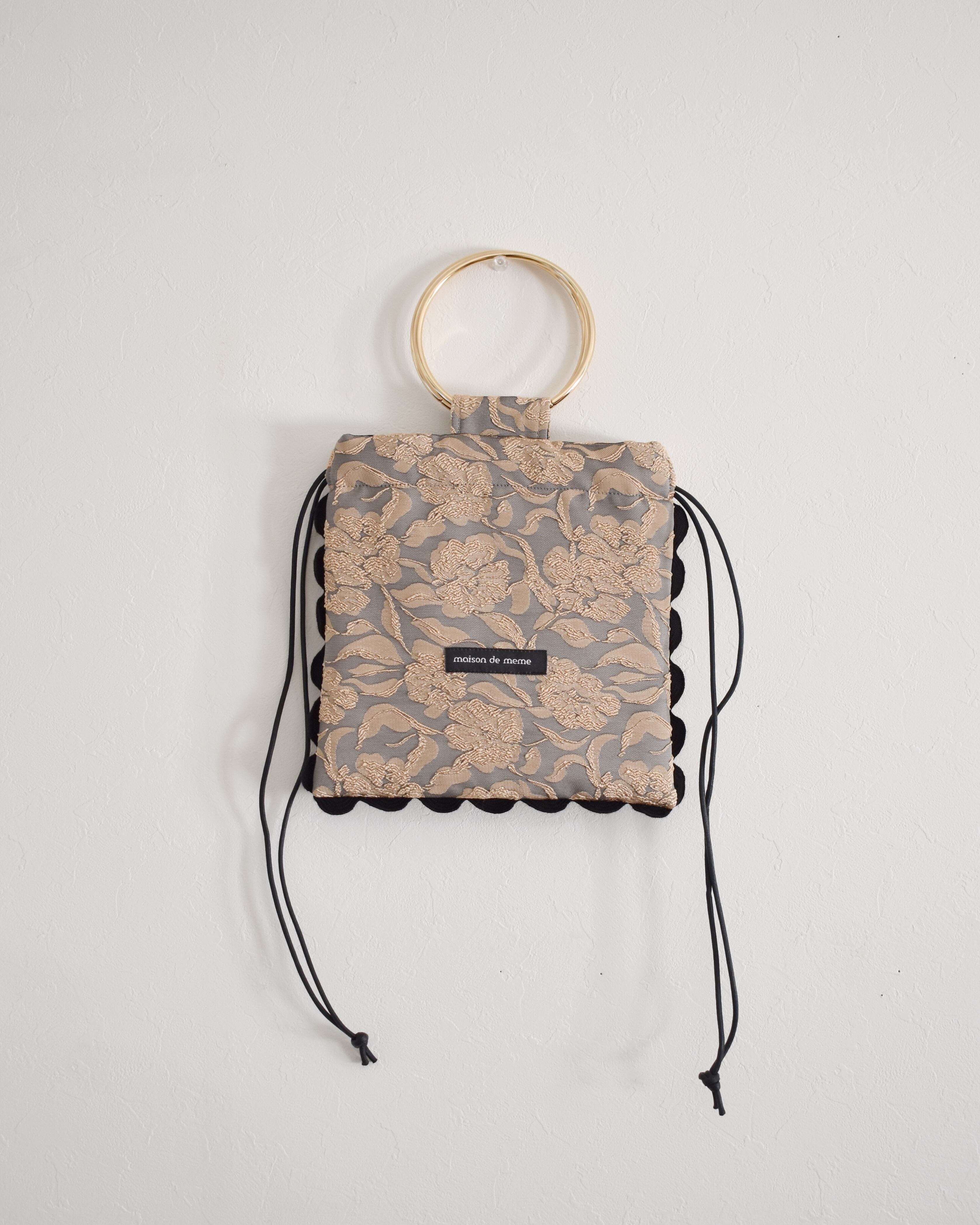 ジャガード生地の美しさを“額縁”のように閉じ込めた、スクエア型の巾着バッグ。